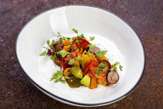 ШАГ 2 Помидоры, папайю и авокадо нарезать мелкими кубиками. Петрушку и эстрагон мелко порубить. Все переложить в миску и заправить соусом.