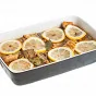 ШАГ 3 Всю рыбу уложить в керамическую посуду кожей вверх, залить маринадом. Если маринад не покрывает рыбу полностью, смешать воду с уксусом в пропорции 3:1 и долить. Сверху выложить лавровый лист и ломтики лимона. Убрать в холодильник на 12 часов, после чего можно будет ее подавать. Эскабече хранится в холодильнике неделю.