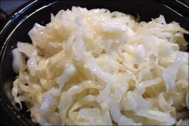 ШАГ 1 Нашинковать 1 кг капусты, плотно уложить в банку. Если предварительно ее хорошенько помять (до сока), она заквасится быстрее. Но в итоге получится менее хрустящей, хотя вкус останется тот же.