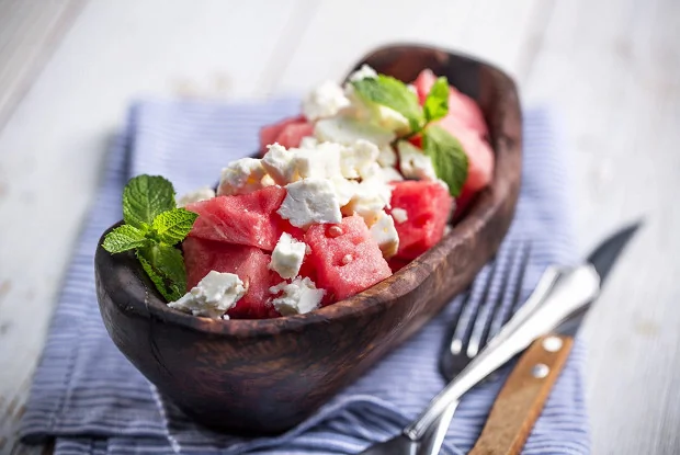 ШАГ 2 Сыр фета поломать на мелкие кусочки и посыпать поверх арбуза.