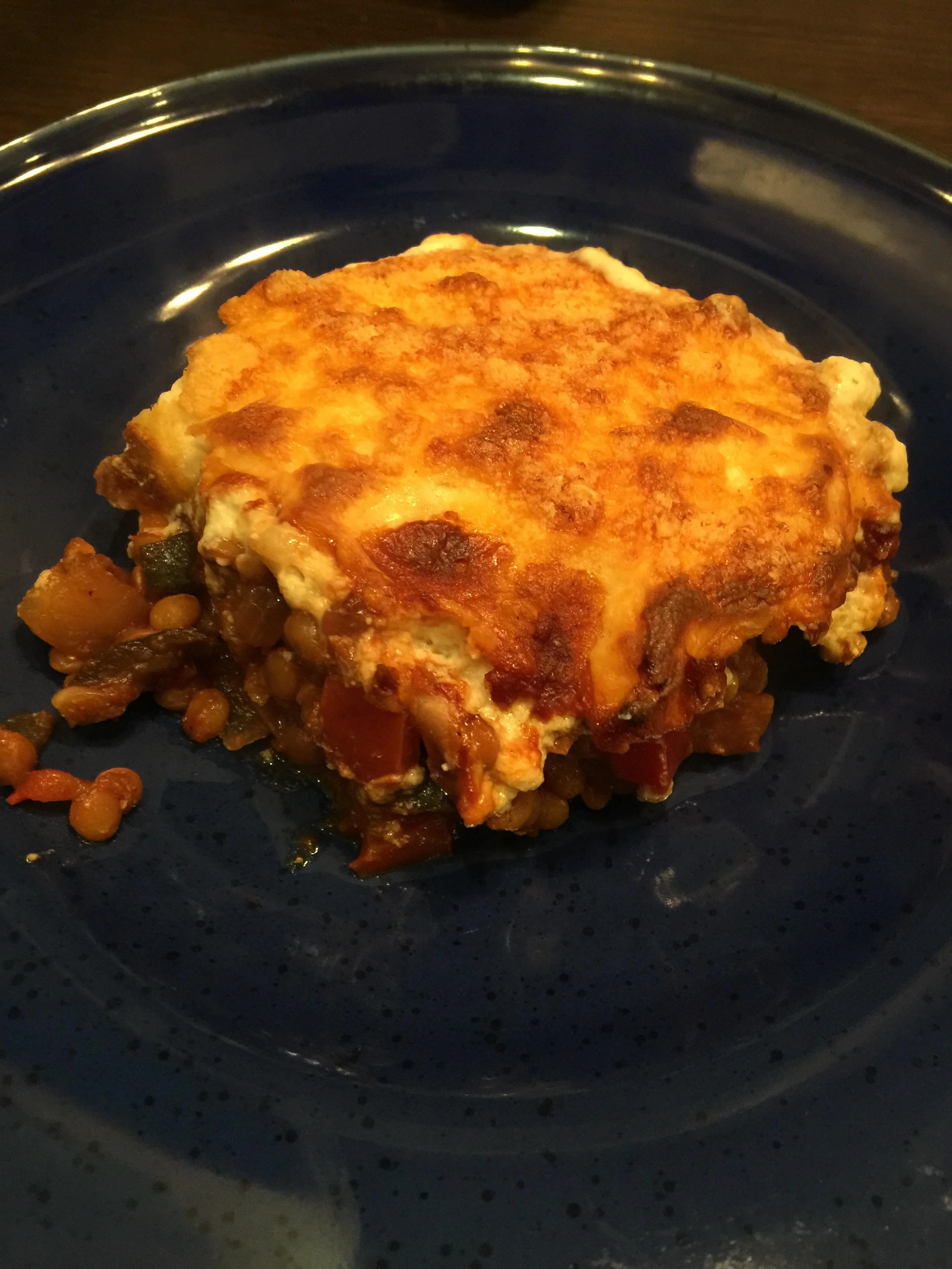 ШАГ 7 Овощи и чечевицу переложить в форму, залить сырным соусом, посыпать пармезаном и готовить в течение 1 часа при 180 градусах.
