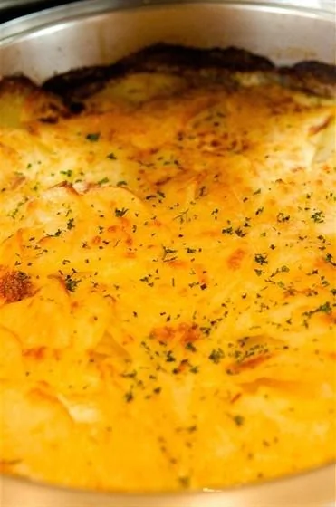 ШАГ 7 Сверху положите кусочки сливочного масла и запекайте 40-50 минут, пока картошка не станет золотистой сверху. Проткните вилкой, если картошка еще твердая, поставьте в духовку еще на 10 минут.
