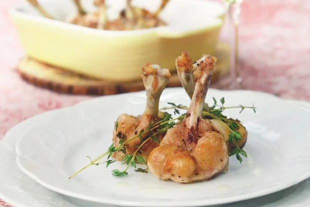 ШАГ 3 Готовые вывертыши выложить косточками вверх в подходящую форму для запекания, залить содержимым сковородки. Поставить в горячую духовку (180–200 градусов) на 5–10 минут.