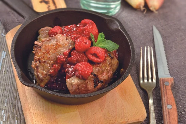 ШАГ 3 В сковороду добавить малину без плодоножек (немного ягод оставить для украшения) и тушить на среднем огне еще 4–5 минут. Затем добавить винный уксус и сливочное масло, перемешать. Если на вкус соус будет кисловат, добавить немного сахара.