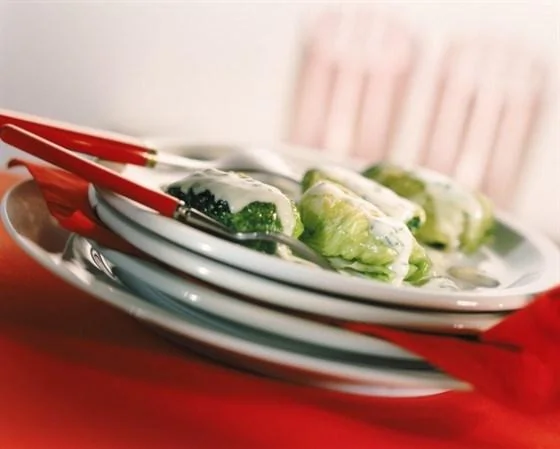 ШАГ 4 Намажьте смесью листья, положите немного бобовых проростков, нарезанного шнитт-лука и нарезанного длинными полосками зеленого лука.