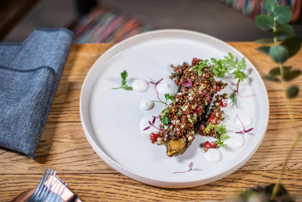 ШАГ 5 Прогреть баклажан в духовке (180 градусов, 10 минут). Баклажан должен быть теплым, но не горячим. На тарелку положить сметану. Поверх сметаны положить теплый баклажан. Поверх баклажана положить табуле из киноа и украсить миксом микротрав.