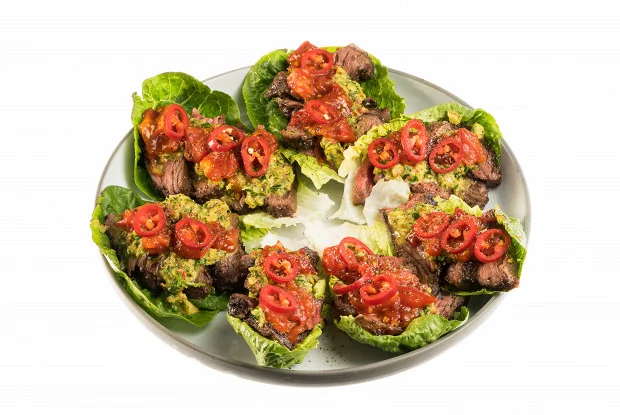 ШАГ 5 Оставшуюся половину перца чили нарезать тонкими колечками. Стейк нарезать крупными кусочками. На тарелку выложить листья мини-романо, на них выложить мясо, сверху чимичурри и жареные помидоры. Украсить колечками чили и посыпать черным перцем.