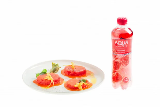 ШАГ 5 На тарелку выложить нарезаный арбуз, полить соусом понзу и оливковым маслом, посолить, вокруг арбуза налить морковно-малиновую водицу, с краю выложить кнелю гуакамоле, украсить кислицей.