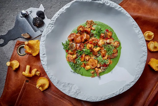 ШАГ 3 На тарелку вылить соус (пару половников), выложить лисички, чили, сверху натереть трюфель или присыпать хрустящим луком фри.