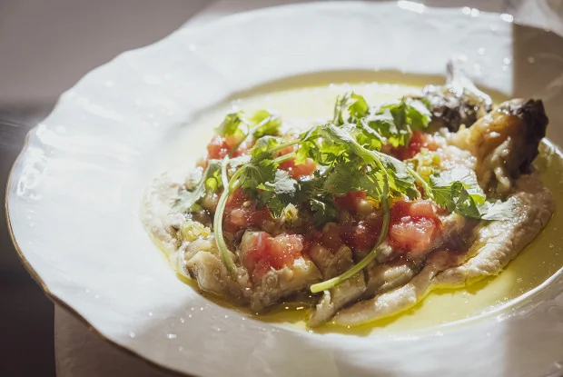 ШАГ 6 Выложить на тарелку соус тахини, сверху запеченный баклажан, полить тартаром из помидоров и сальсой из чили. Добавить морскую соль, подавать со свежей кинзой.