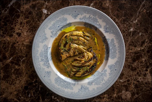 ШАГ 1 Приготовить капусту. Кочан молодой капусты среднего размера (можно использовать и красную, и белокочанную, последняя чуть плотнее и готовится чуть дольше), полить оливковым маслом, посыпать солью и дробленым черным перцем. Завернуть в два слоя фольги и убрать в духовку на 1,5–2 часа при температуре 230 градусов. Если есть угольный гриль, готовить нужно в нем, — за полтора часа капуста дойдет до нужной текстуры и получит отличный дымный аромат. Затем развернуть капусту, убрать сгоревшие верхние листы и разрезать капусту на дольки.