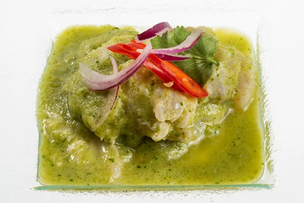 ШАГ 5 В охлажденную рыбу добавить измельченный чеснок, нарезанный колечками чили, сок лайма, перемешать, добавить соус, снова перемешать и подавать немедленно.