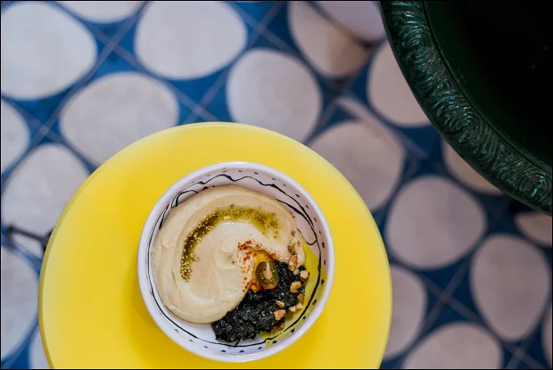 ШАГ 6 Выложить хумус на тарелку, полить оливковым маслом, смешанным с заатаром.