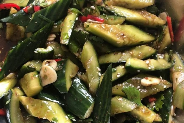 Огурцы Кешью Кунжутные семечки Кунжутное масло Тыквенное масло Устричный соус Зеленый лук Соевый соус Рисовый уксус Семена кориандра Свежая кинза (кориандр) Сок лайма Тростниковый сахар Перец чили Имбирь Чеснок главная Закуски Паназиатск