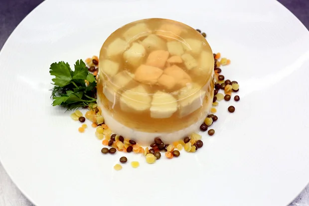 ШАГ 10 Когда и последний слой застынет, достать форму. Взять деревянную палочку, вставить ее между краями формы и желе. Достать палочкой до дна формы. Как только между желе и формой окажется воздух, желе будет готово отделиться. Перевернуть форму с желе на заранее приготовленную тарелку и дождаться, пока оно аккуратно выползет на тарелку. Украсить заливную рыбу разноцветной вареной чечевицей, которая будет напоминать о речных камушках, и зеленью.