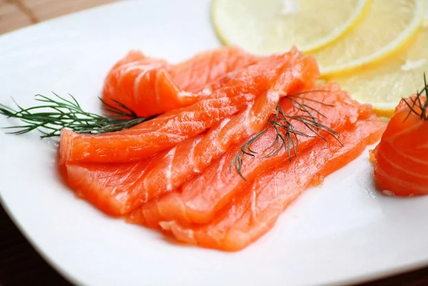 ШАГ 1 Мариновать пластами: к свежему лососю добавить водку и мед, сверху соль, свежий укроп и кольца апельсина.