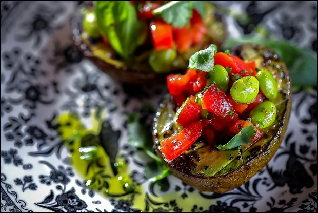 Ингредиенты для приготовления Жареное на гриле авокадо с эдамамэ и томатами: