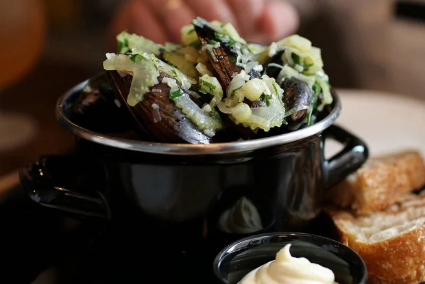 ШАГ 1 Внимательно осмотреть каждую ракушку: свежие мидии обязательно должны быть закрыты. Открытая сырая мидия — признак порчи. Варено-мороженые мидии должны быть открыты. Если на ракушке мидии виден скол — такую есть нельзя, это опасно. Поскоблить ракушки ножом либо железной губкой для посуды, на случай если на ней остались следы водорослей и ворсинки. Но песка на зубах все равно не избежать, такова специфика продукта.