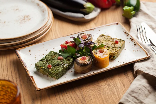 ШАГ 7 Для подачи выложить через форму (можно использовать формочки для печенья) на блюдо массу из шпината и фасоли. Рядом разложить рулетики из баклажанов и кусочки перца.