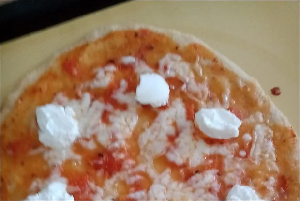 ШАГ 4 Раскатать тесто на противне. Намазать томатной пастой, посыпать оставшейся тертой моцареллой и творожным сыром.