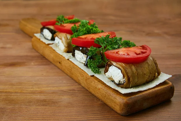 ШАГ 3 Выложить на каждый ломтик баклажана по 1 столовой ложке надуги и свернуть в рулет.