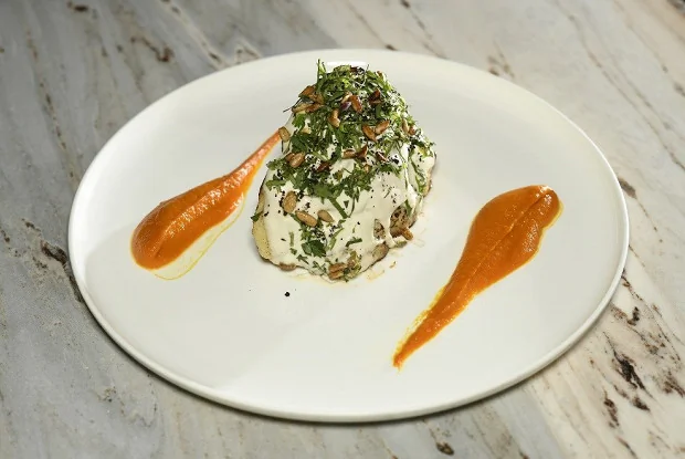 ШАГ 4 Обжаренную капусту полить йогуртом из кешью, посыпать рубленой зеленью, каперсами, мелконарезанным красным луком, семечками подсолнуха в карамели и пудрой из обжаренных семян конопли.