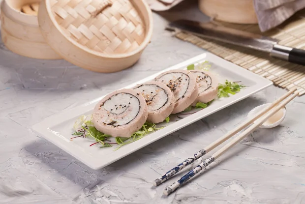 ШАГ 5 На лист морской капусты выложить массу из другой рыбы. С помощью пищевой пленки свернуть все в плотный рулет и убрать в холодильник на несколько часов, а лучше на ночь.