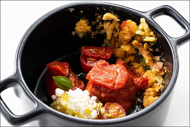 ШАГ 8 Подогреть томатный соус, довести до кипения, бросить в него гренки и, постоянно помешивая, пропитать их соусом, чтобы они стали полностью мягкими. Проверить это можно, воткнув в них шпажку или зубочистку.