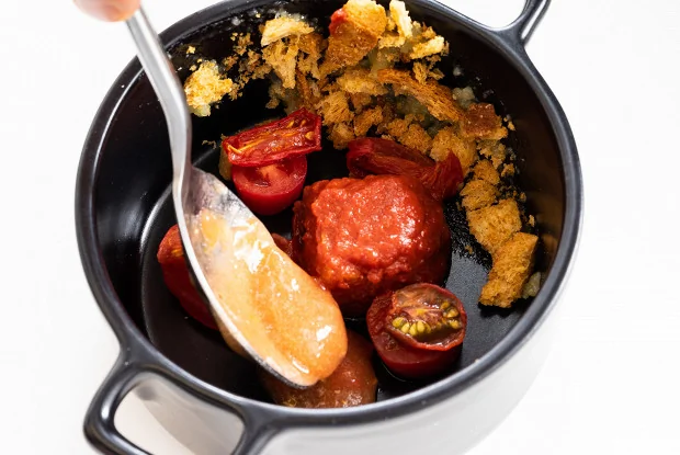 ШАГ 3 Отжать желатин и подогреть его в сотейнике или микроволновке. Соединить с помидорной массой и убрать в холодильник до загущения.