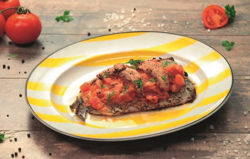 ШАГ 6 Выложить на блюдо сельдь, а сверху — помидоры и немного икры и молоки. Украсить укропом.