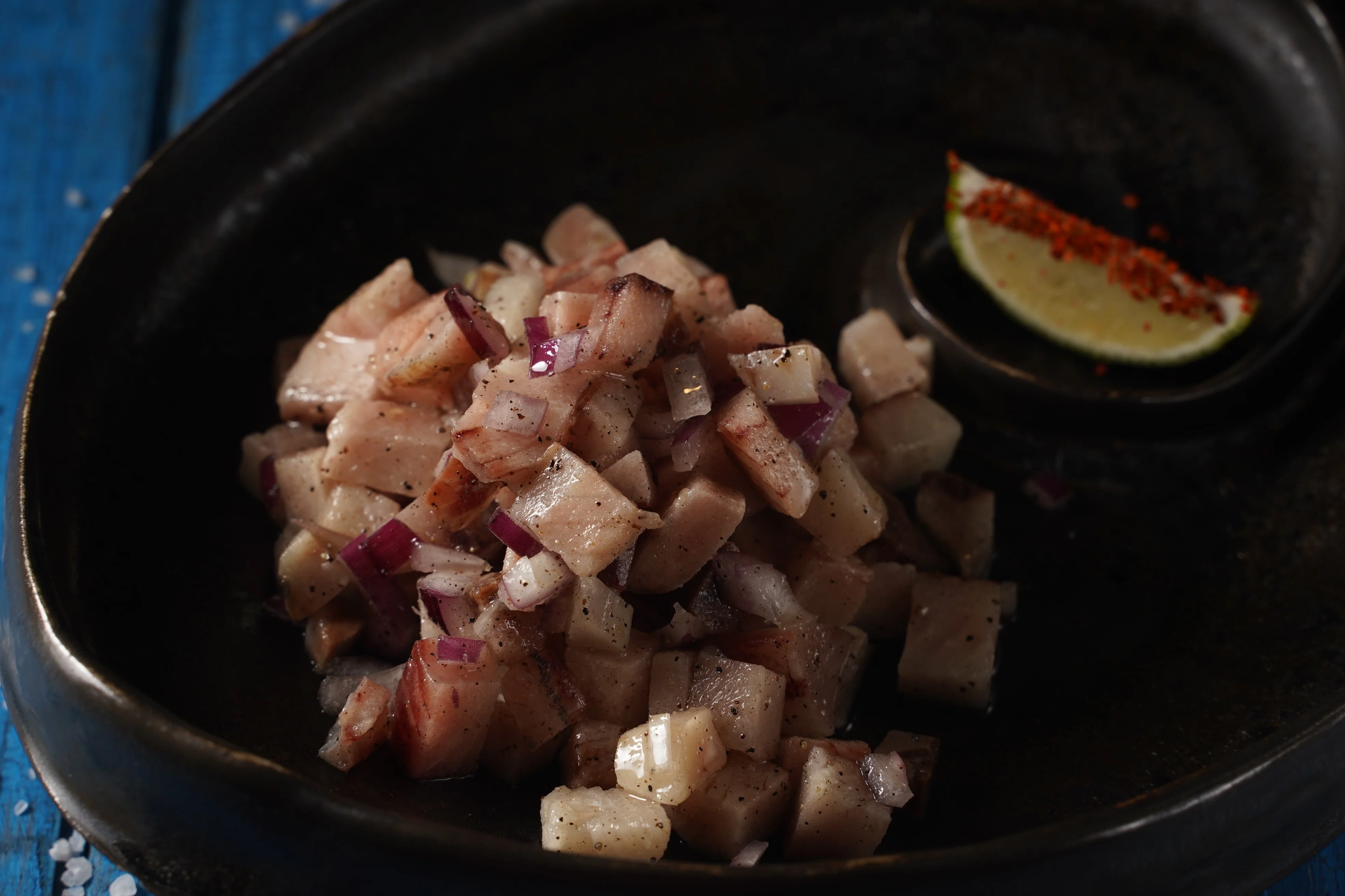 ШАГ 5 Выложить рыбу в тарелку. Ломтик лайма окунуть в красный перец и украсить им блюдо.