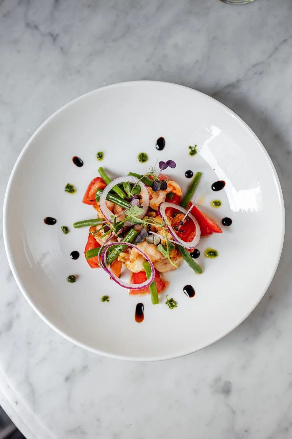 ШАГ 5 Смешать креветки с томатами, фасолью, луком, базиликом и кедровыми орехами. Заправить оливковым маслом с лимоном. Украсить тарелку каплями песто и бальзамиком.