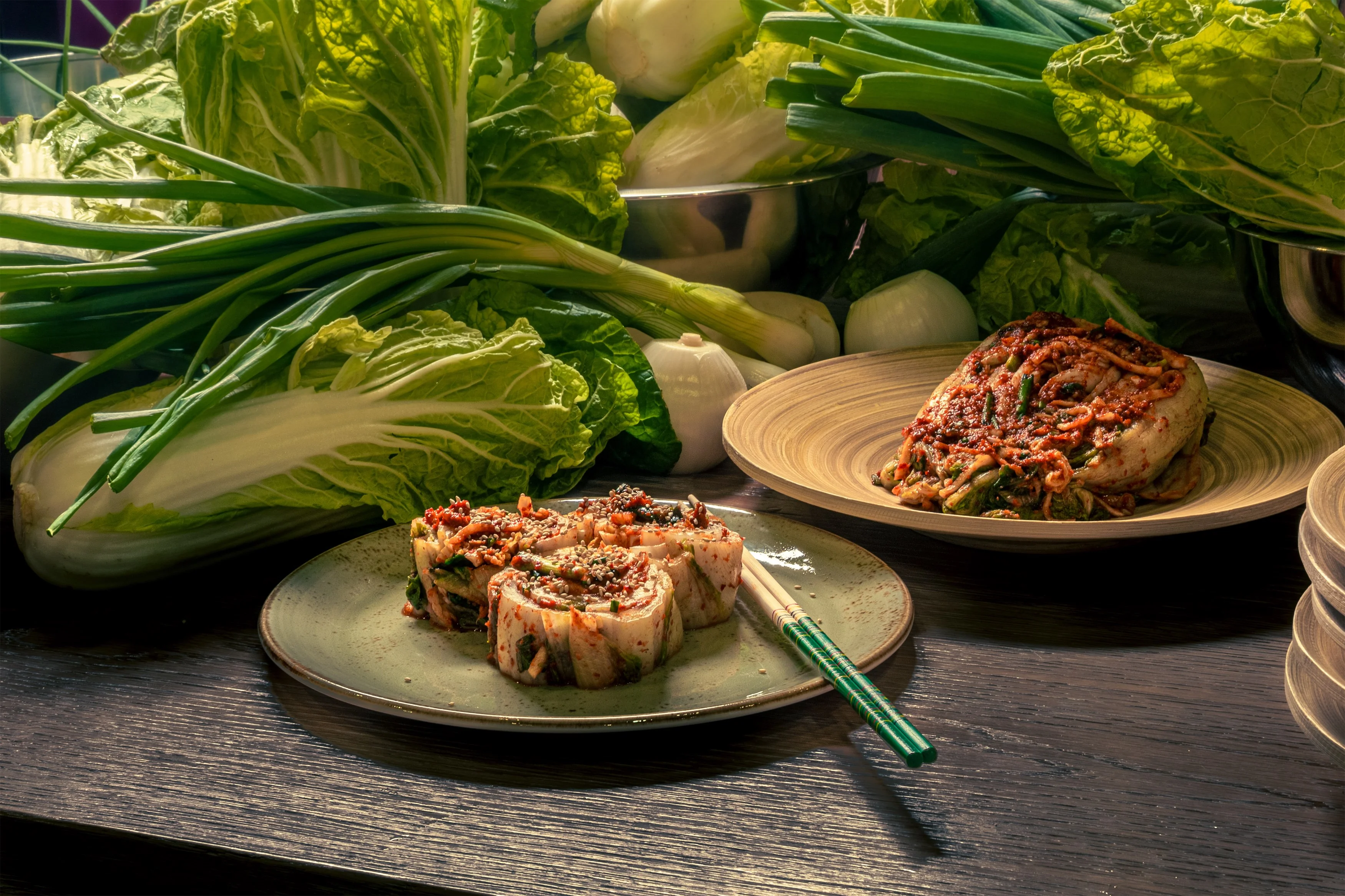 ШАГ 10 Кимчи можно есть сразу же или оставить на потом. Для этого верхний лист необходимо обернуть вокруг капусты и сложить ее пополам, убрав мягкие листья под основание, стараясь выпустить из нее весь воздух. Переложить в контейнер и хранить в холодильнике или без него до 5 лет.