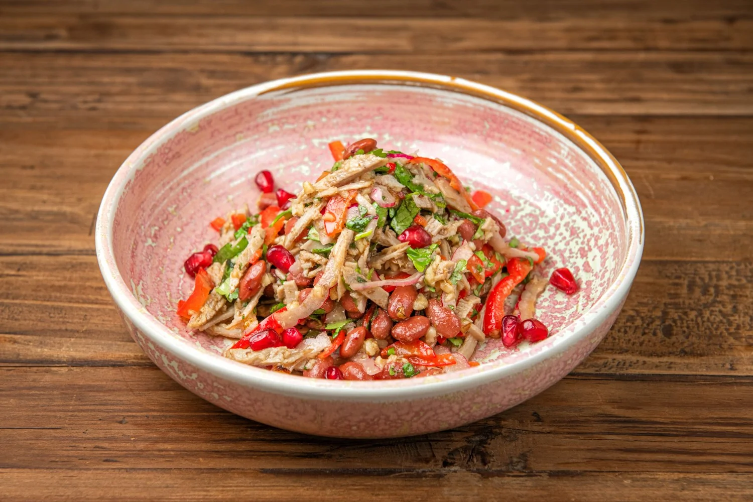 ШАГ 7 Соединить в посуде для подачи мякоть баклажана, перца, орехи, лук, фасоль и куриное филе. Добавить наршараб и хорошо перемешать.