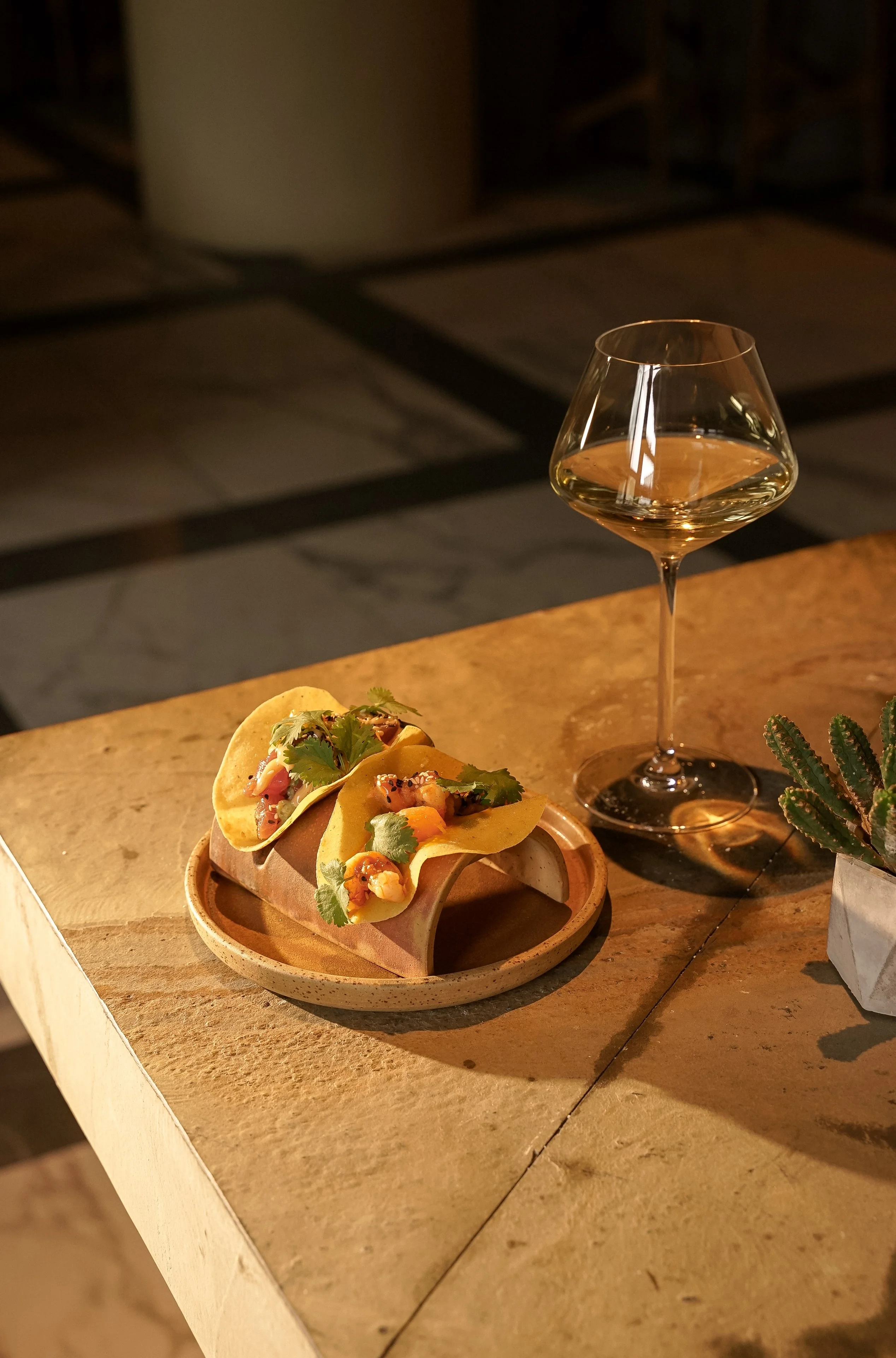 ШАГ 3 На кукурузную лепешку выложить крем из батата, далее — кубики мандарина, затем — креветки и кинзу. Украсить кунжутом.