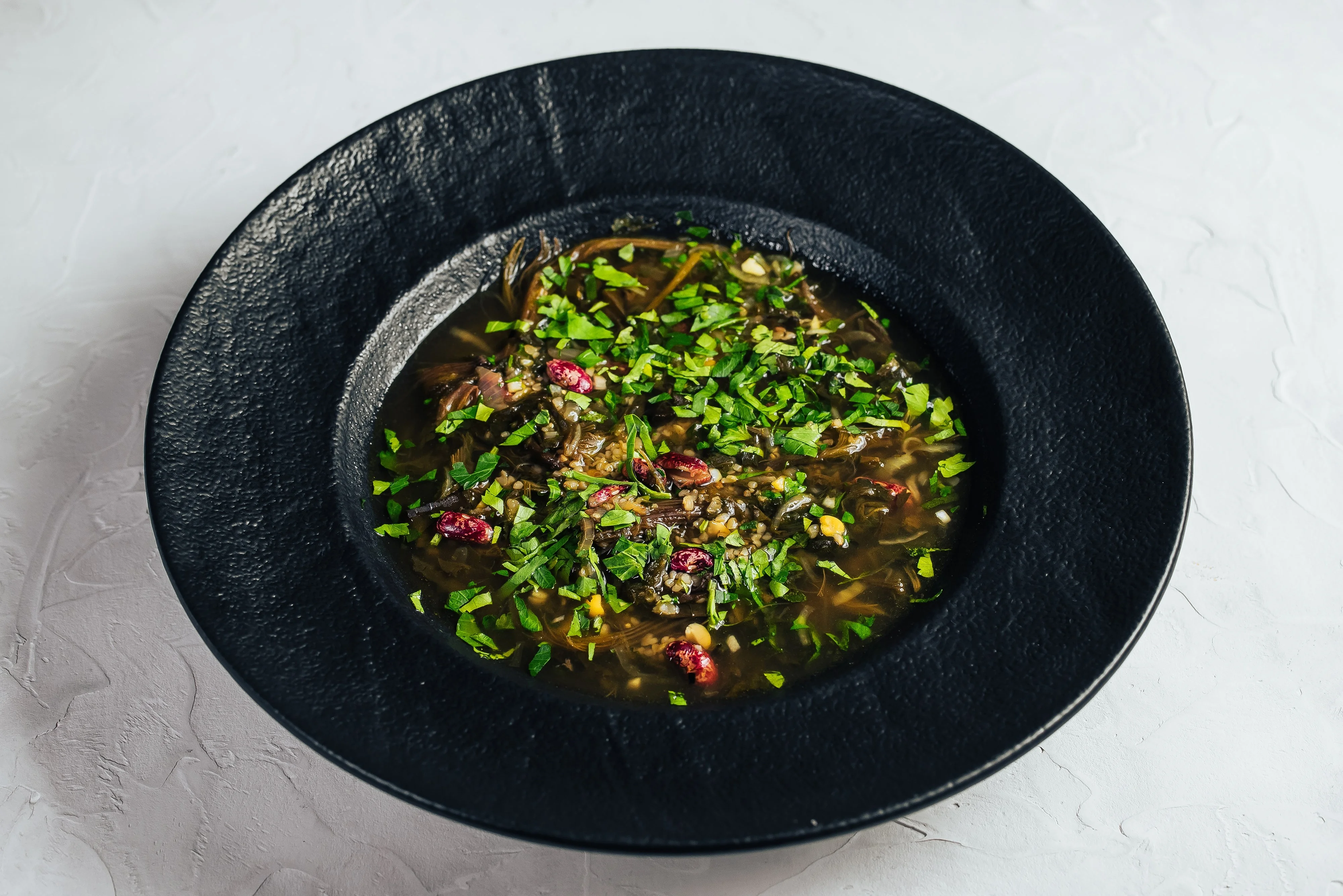 ШАГ 5 Выложить пассеровку в бульон с авелуком. Туда же выложить булгур, фасоль и нут. Довести до кипения, уменьшить огонь до минимального и готовить все вместе до тех пор, пока крупы не станут мягкими. Посолить, поперчить.