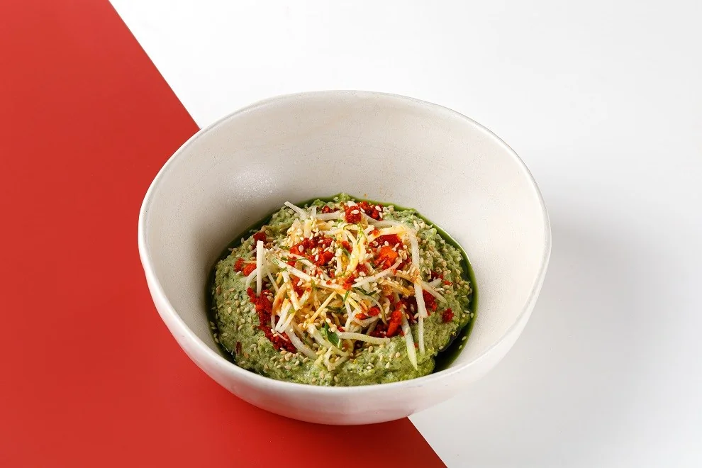 ШАГ 4 Готовый хумус выложить в тарелку, сделать небольшое углубление по центру. Выложить в него цукини. По краям хумуса полить зеленым маслом базилика, посыпать блюдо семенами кунжута, жареным чили с арахисом и цедрой лайма.