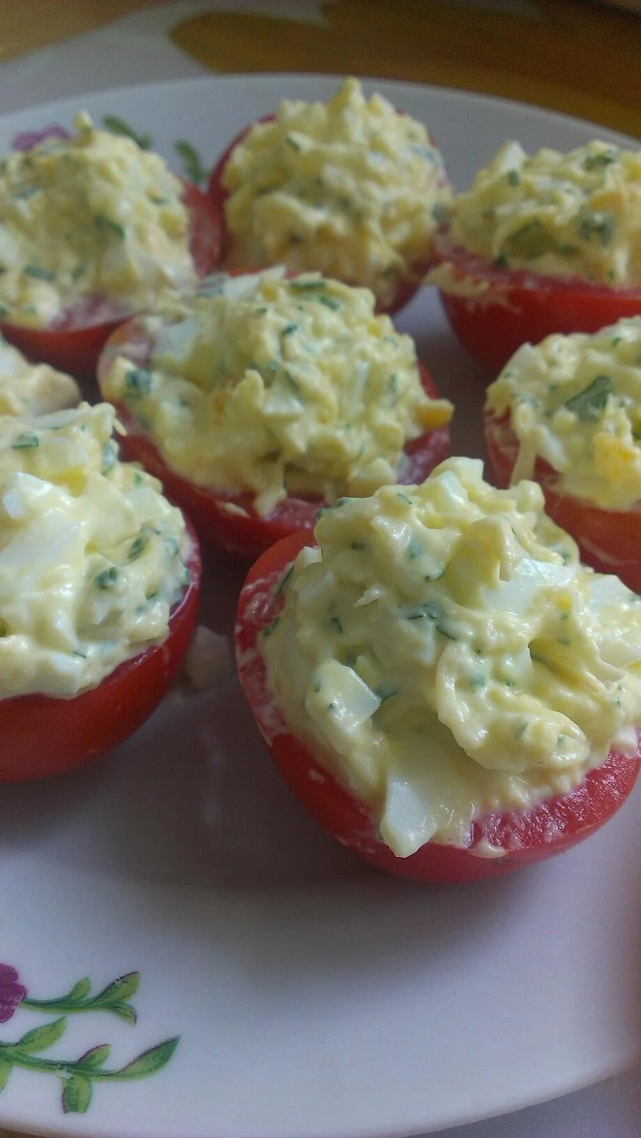 ШАГ 2 Смешать сыр, чеснок и яйцо с майонезом и выложить смесь на кружочки помидоров. Поперчить и украсить зеленью.