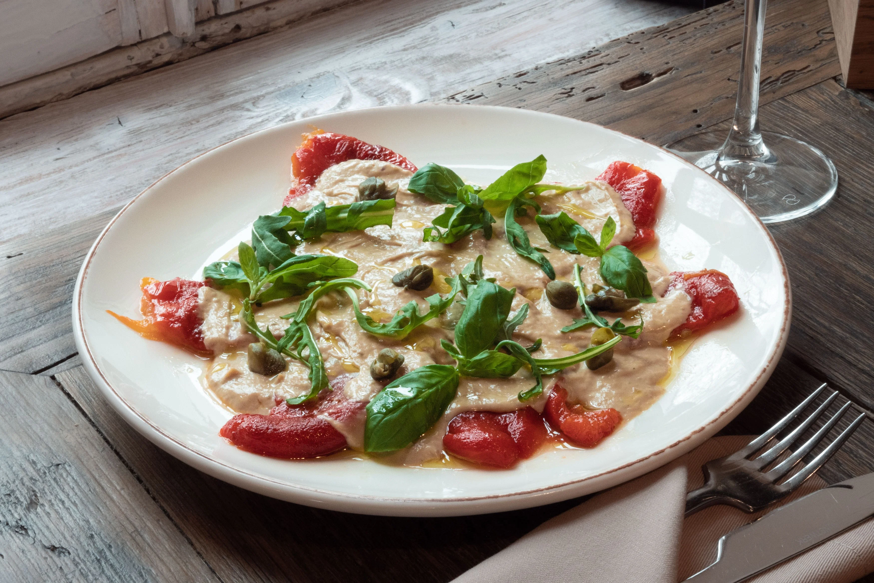 ШАГ 6 Собрать блюдо: выложить на тарелку в произвольном порядке перцы. Залить их соусом. Сверху добавить несколько капель оливкового масла, украсить руколой, базиликом и каперсами.