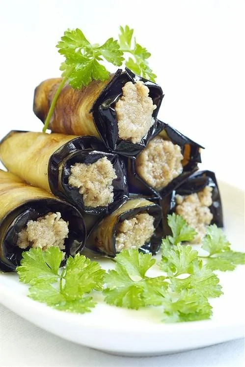 ШАГ 4 Моцареллу нарезать маленькими кусочками, посыпать ими пласты баклажана, сверху положить начинку. Скатать рулетики, завернув кончики ломтиков у основания.