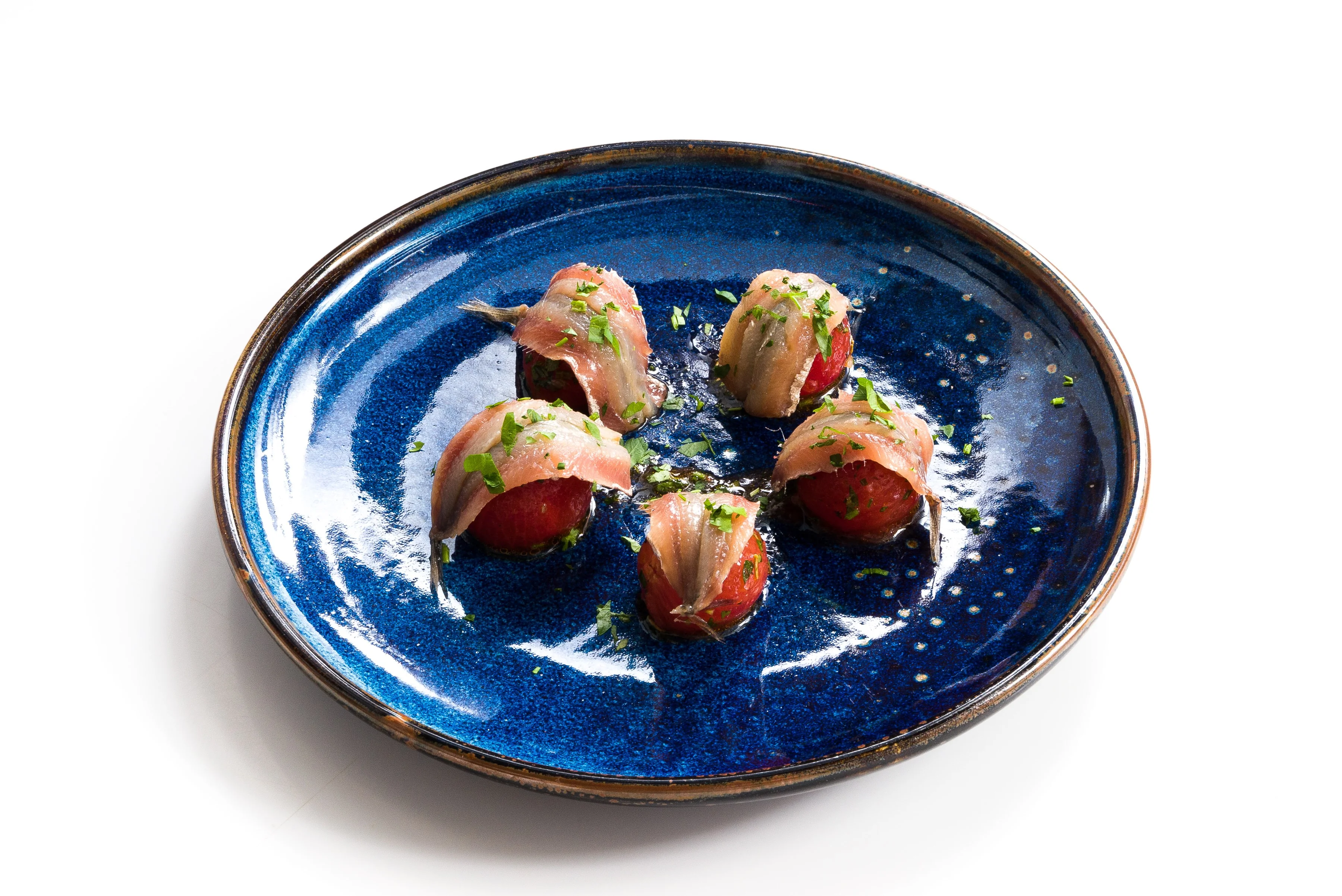 ШАГ 10 Перед подачей выложить помидоры по 5 штук на блюдо, на каждый красиво выложить рыбку. Посыпать рубленой петрушкой и подавать.