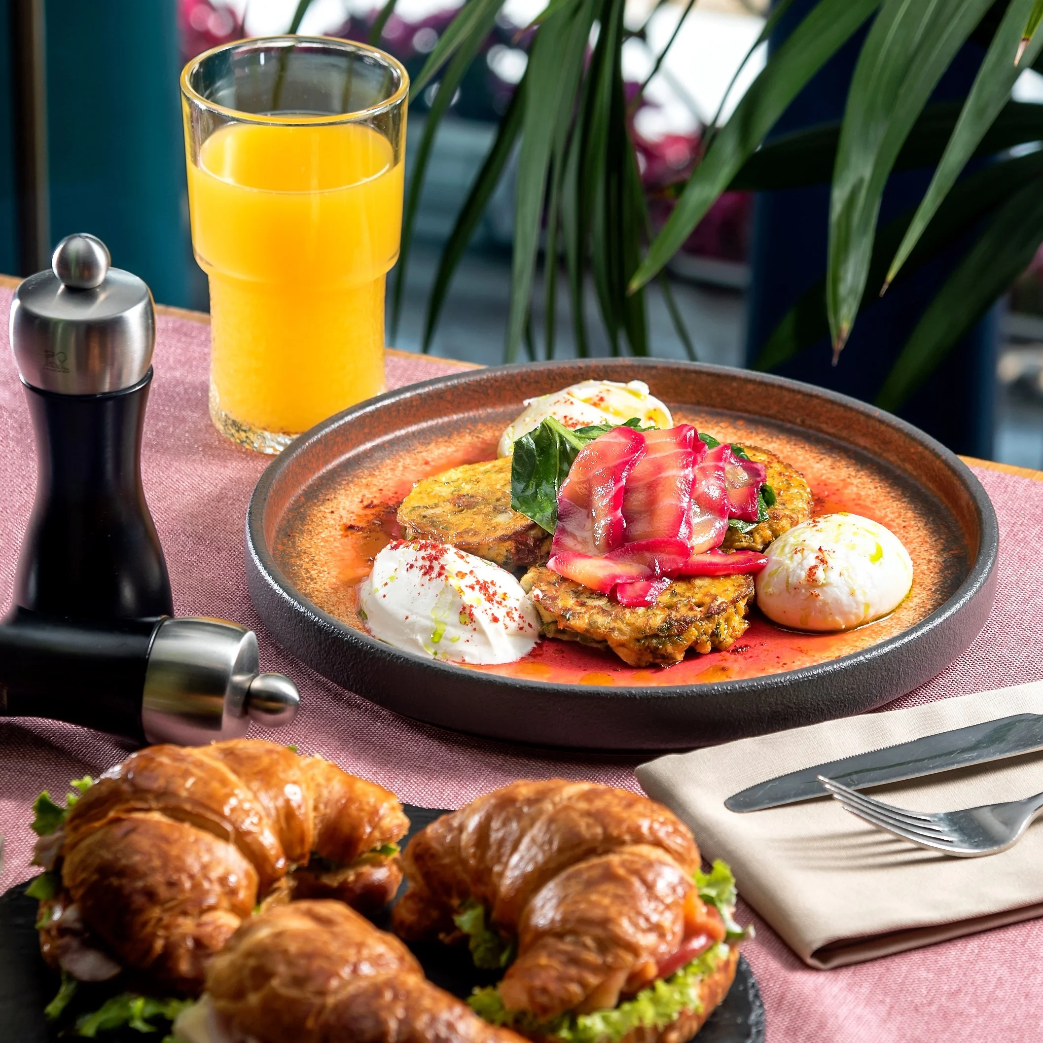 ШАГ 5 Выложить оладью в центр тарелки, сопроводить слайсами слабосоленого лосося, можно с яйцами пашот и припущенным шпинатом. Подавать со сметаной.