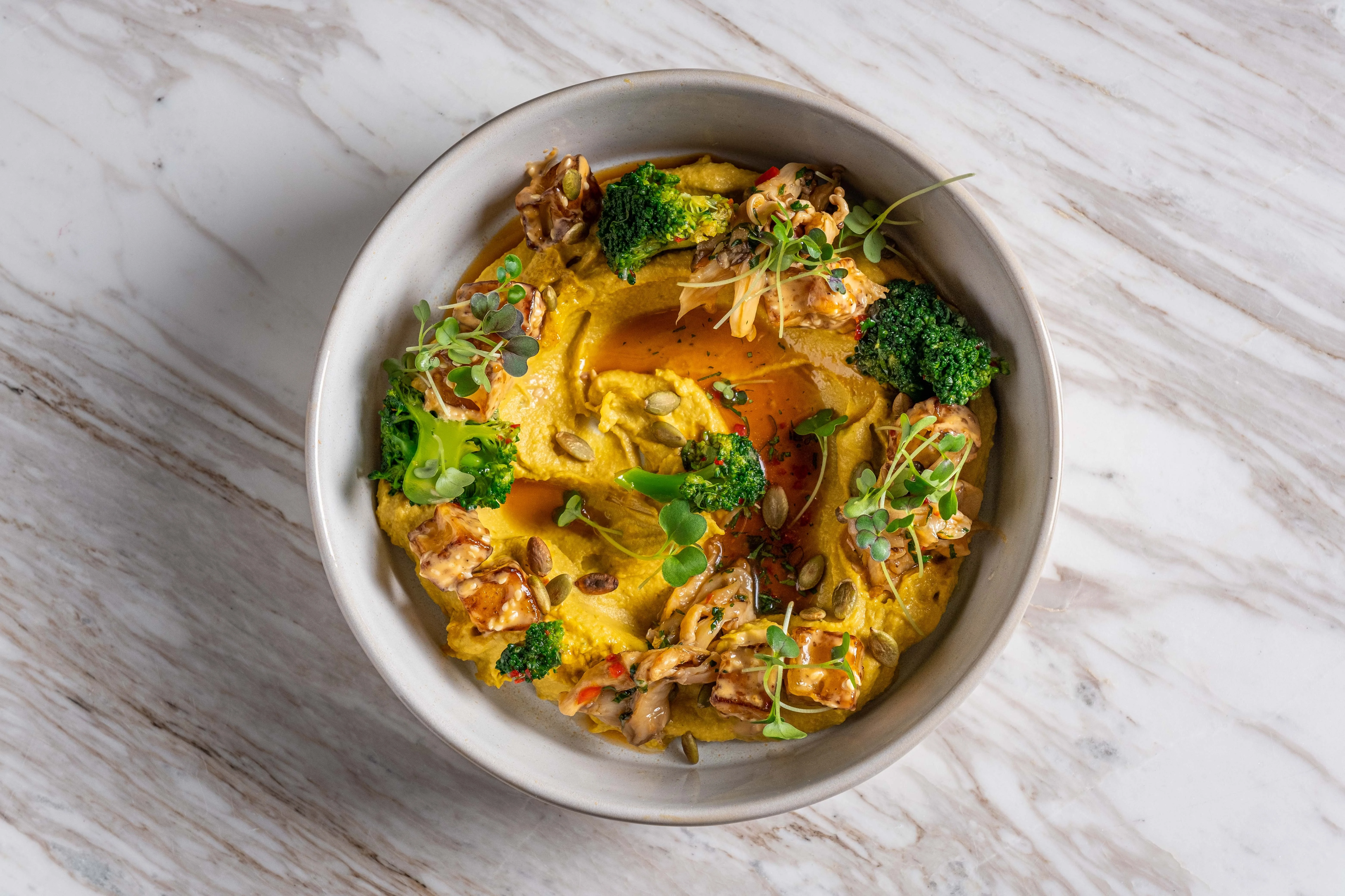 Нут Сушеный перец чили Тыква Растительное масло Чеснок Кинза Лимонный сок Вешенки Капуста брокколи Баклажаны Соевый соус Кунжутное масло Сахар Соус чили Уксус Тыквенные семечки главная Закуски Авторская кухня Веганская еда Хумус