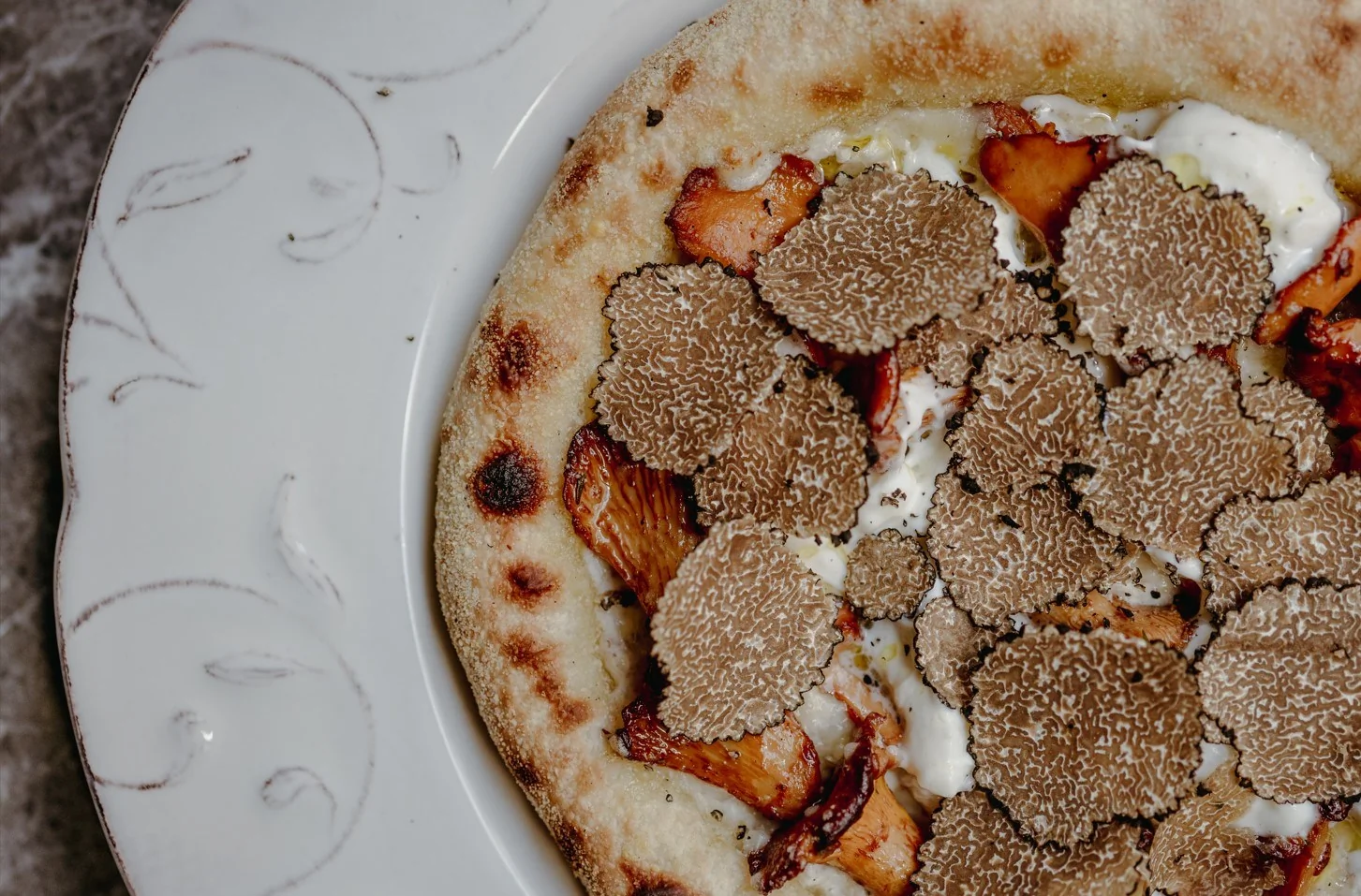 ШАГ 12 Начинить лепешку трюфельным крем-чизом, сверху выложить страчателлу, лисички и сбрызнуть трюфельным маслом. Отправить обратно в печь на 5–7 минут.