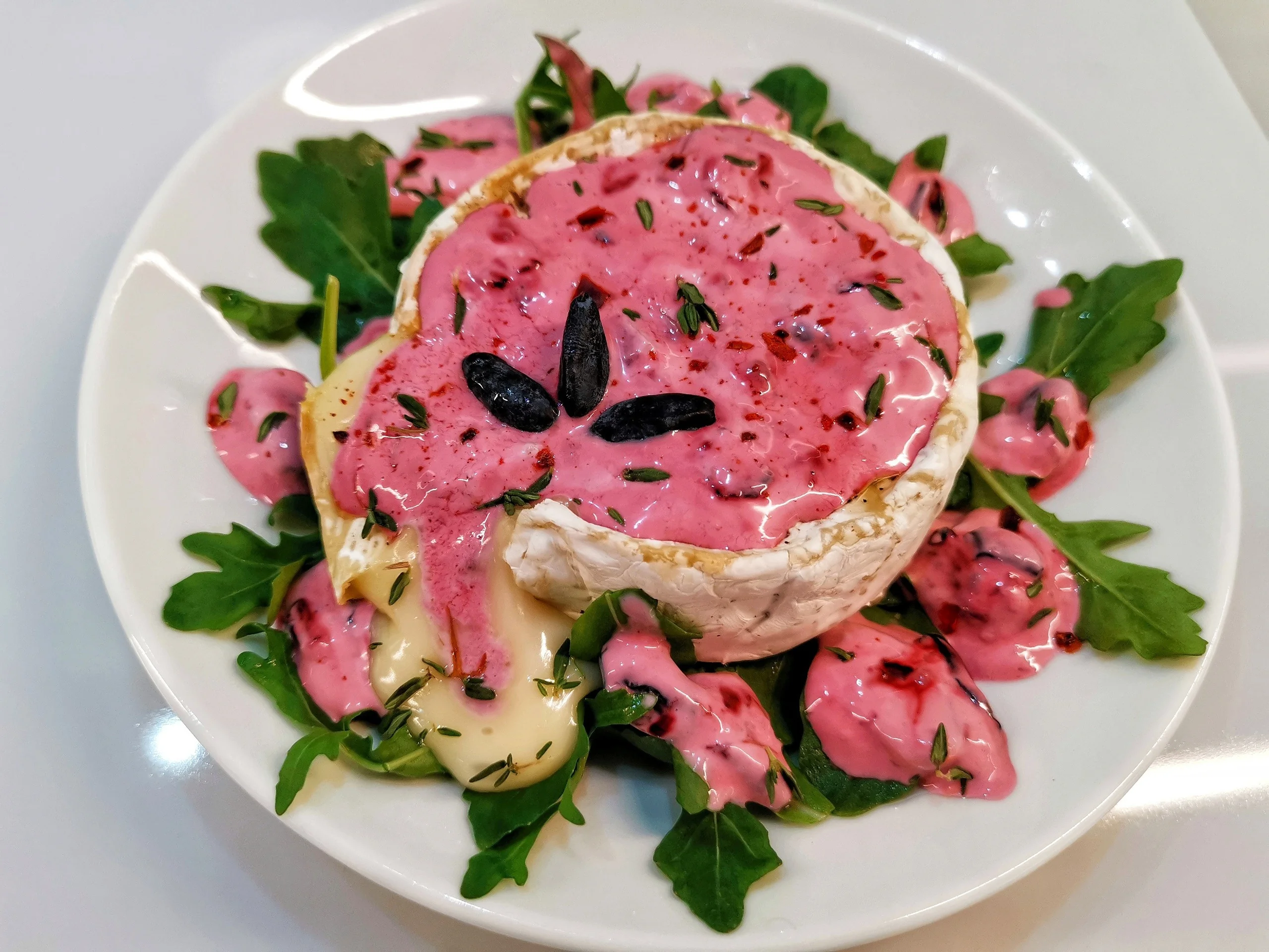 ШАГ 11 Добавить несколько ягод сверху, сделать надрез на сыре так, чтобы он растекся, и подавать.