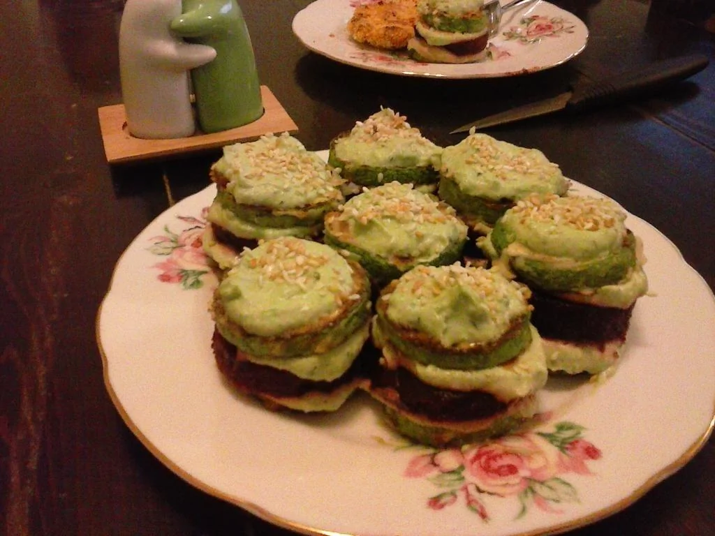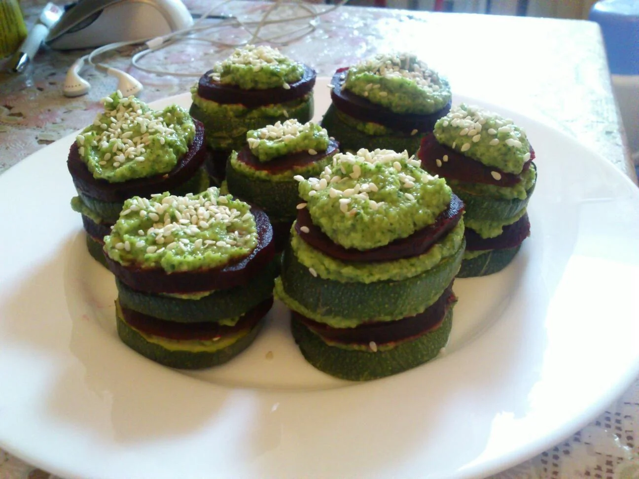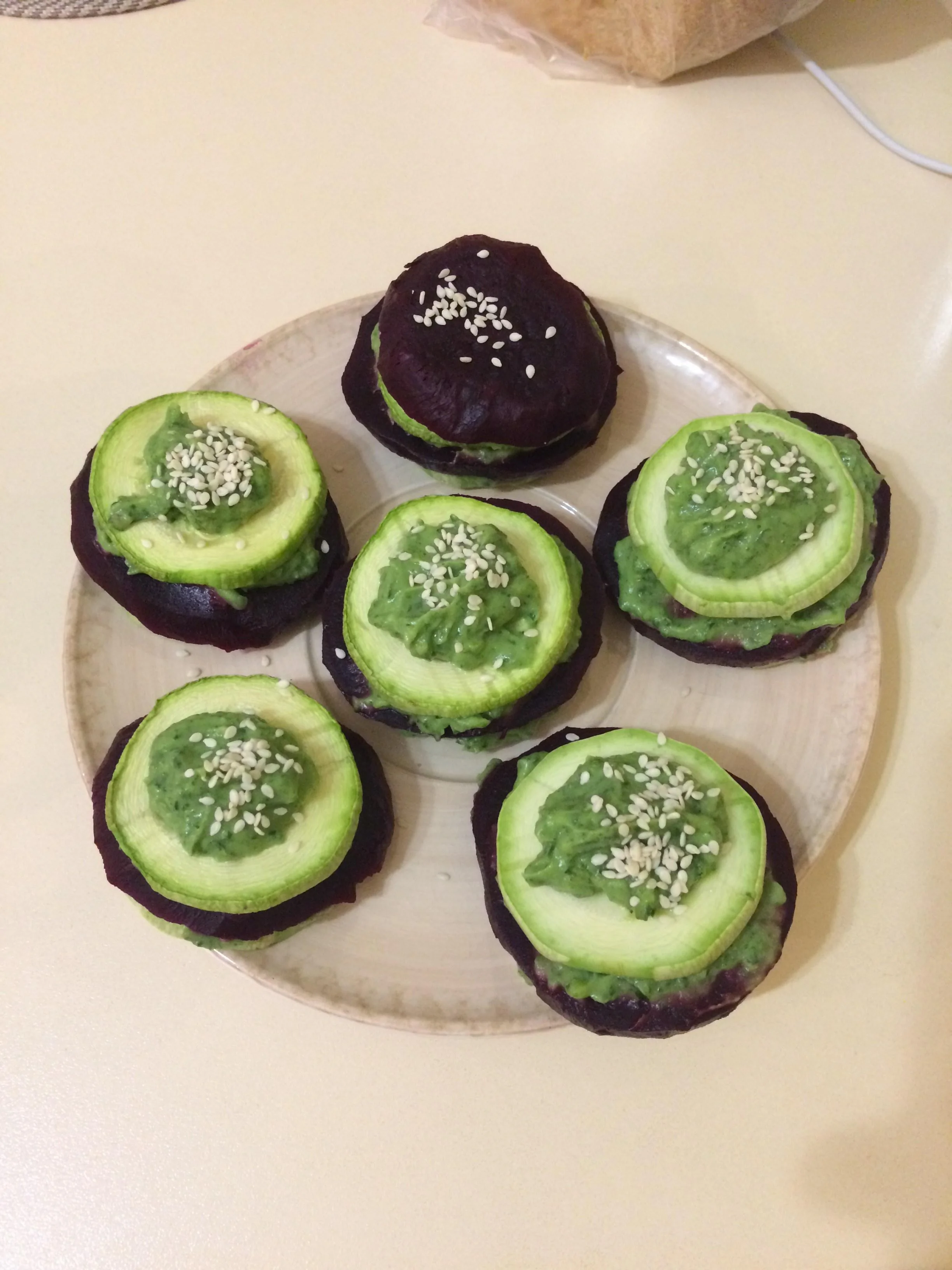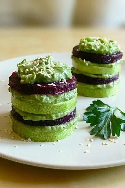 ШАГ 4 Выложить на порционную тарелку кружочек свеклы - промазать кремом, затем кружок кабачка - промазать кремом. И так выкладывать ровно столько уровней, сколько вам нравится.