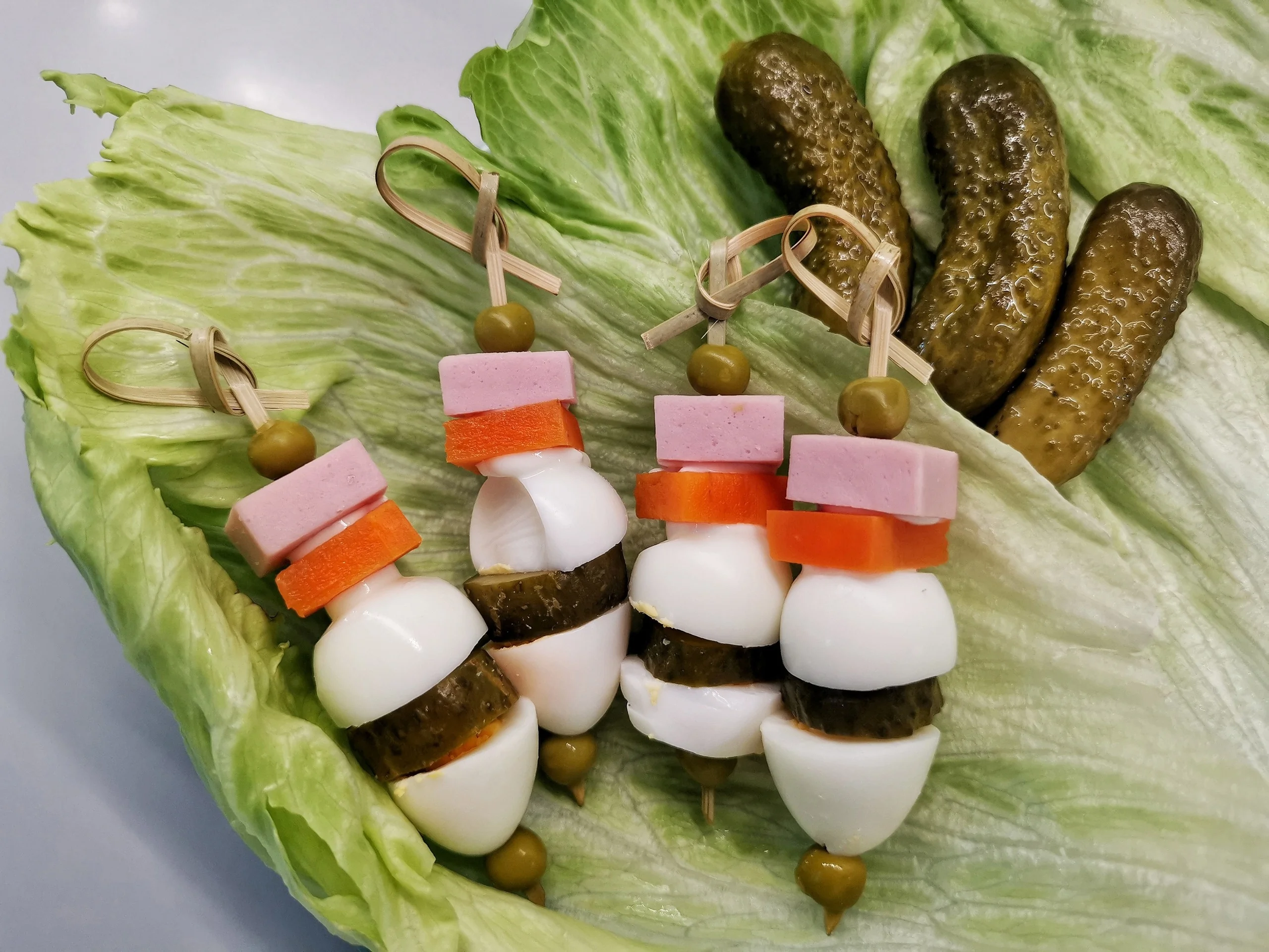 ШАГ 12 Снова наколоть яйца и завершить канапе горошком.