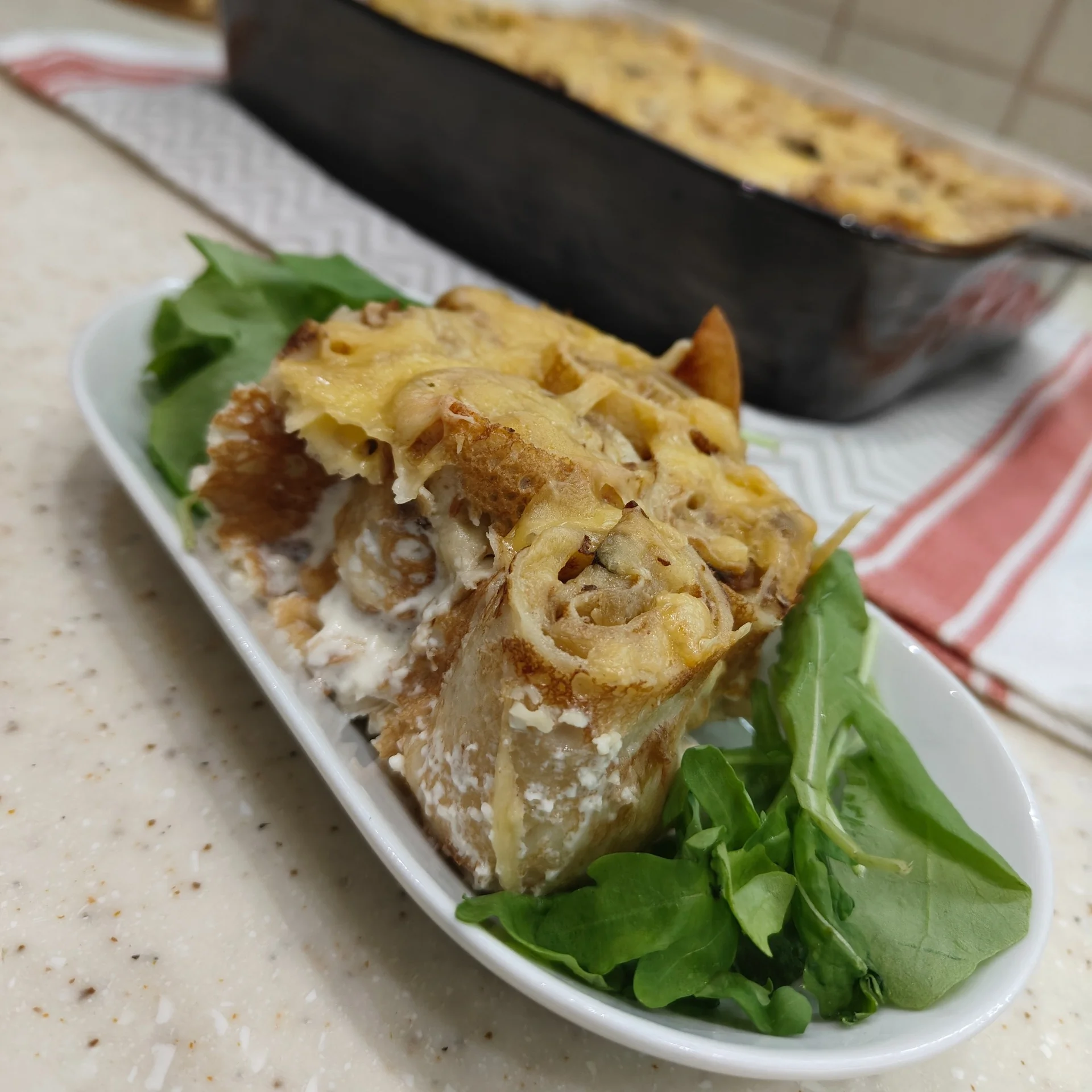 ШАГ 19 Выложить стоя каждый рулетик, плотно прижимая друг к другу, в форму, смазанную сливочным маслом.