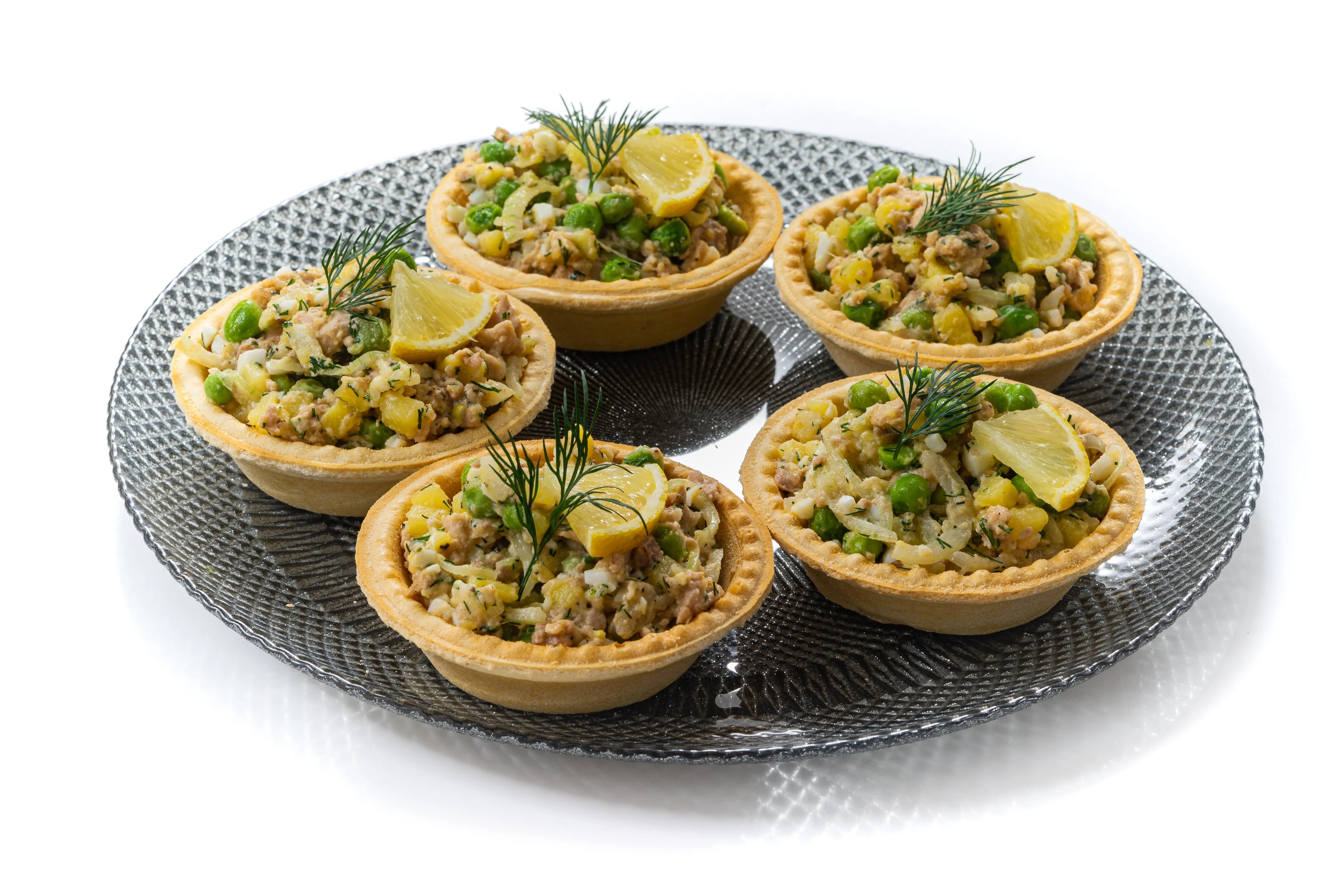 ШАГ 11 Выложить начинку в тарталетки, украсить укропом, ломтиком лимона и подавать.