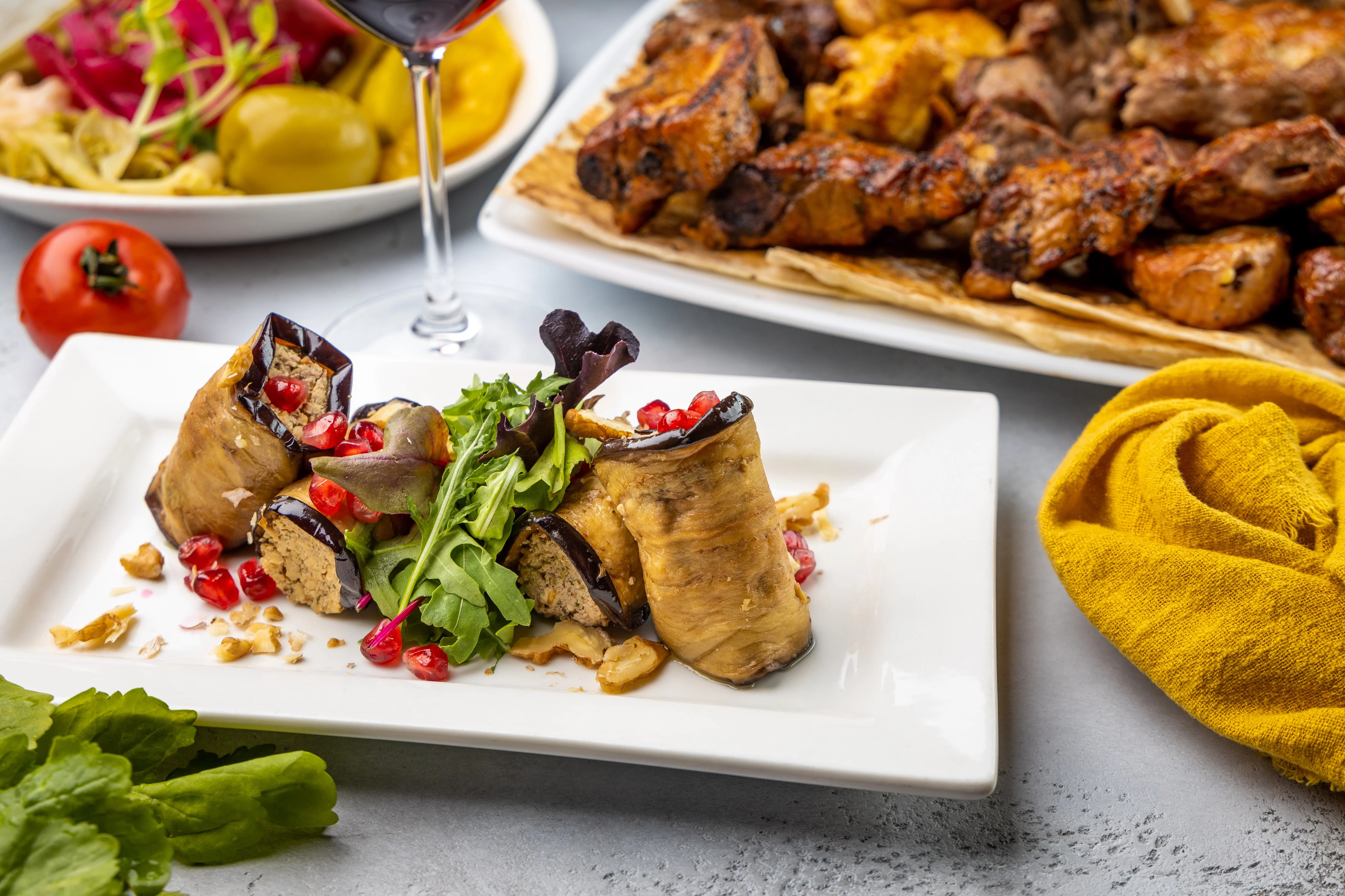 Баклажаны Грецкие орехи Кинза Чеснок Соль Молотый черный перец Растительное масло Зерна граната Камац-мацун Главная Закуски Грузинская кухня Холодные закуски Рулетики